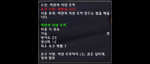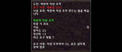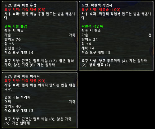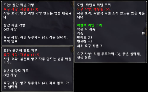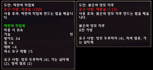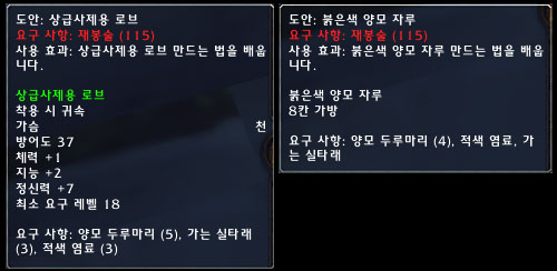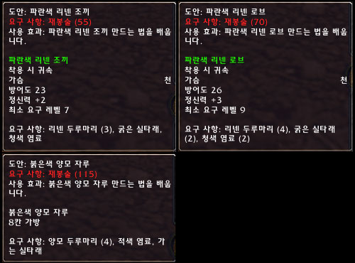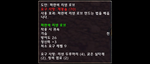 한정판매 도안: 파란색 리넨 조끼(2실버), 파란색 리넨 로브(3실버), 붉은색 양모