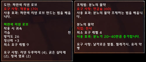한정판매 도안: 파란색 리넨 로브(1실버), 분노의 물약(3실버)