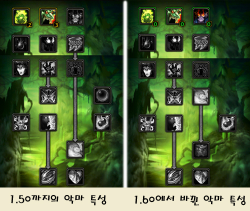 첫번째로 가장 눈에 들어오는 것은 마의 지능(임프와 보이드워커, 서큐버스, 지옥 사냥개의 최대 마나가 증가하는 특성)에서부터 이어져 내려오던 트리 구조가 마의 지능이나 마의 체력을 따로 올릴 수 있는 트리 구조로 바뀌게 되었다. 사냥꾼의 경우에도 야수의 체력과 기력을 증가시켜주는 특성이 따로 올릴 수 있던 것처럼 흑마법사의 악마 또한 골라 찍는(!!) 재미가 생겼다.