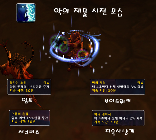 두번째는 악의 제물 특성의 변화다. 기존 특성에서는 악의 제물을 활성화할 경우 소환된 악마를 희생해 지속되는 효력을 부여한다. (임프: 화염주문의 피해 증가, 보이드워커: 최대 생명력 증가, 서큐버스: 암흑주문의 피해 증가, 지옥사냥개: 최대마나 증가의 효과가 있었다) 또한 악마를 소환하게 되면 효과가 취소되었다. 그런 악의 제물 효과가 이번 1.60 패치와 함께 보이드워커와 지옥 사냥개의 효과가 변경 되었다.