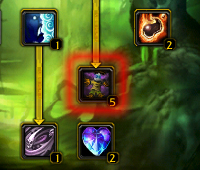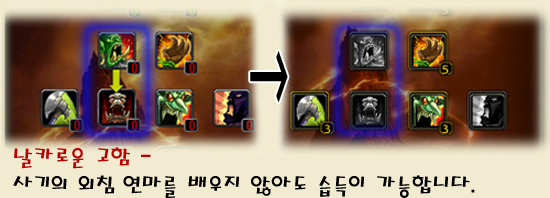 1.60 패치에서 바뀐 흑마법사 악마 특성의 액기스는 바로 새로 추가된 악령술의 대가!(악마 특성 6번째 줄에 있는 특성, 악마 특성 합계 25 포인트 필요) 그 효과는 설명으로만 봐도 입이 벌어질 정도로 엄청난 것이다. 각각의 효과는 해당 소환수를 소환했을 때 흑마법사와 소환수에게 모두 적용되는 것이다. 물론 소환수가 없다면 다음의 효과를 얻을 수 없다. |
