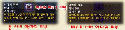 필자가 언데드 흑마법사를 키우던 중 브릴 마을에서 퀘스트 보상으로 주는 약한 재생의 물약을 한잔 거하게 들이키기 위해 클릭하니 "보다 강한 효과"가 있다면서 약한 재생의 물약 사용이 불가능 했다. 악마의 피부 설명에 생명력 회복 속도를 향상 시켜준 다는 말이 써 있기에 재생 물약보다 효과가 좋은 줄로 믿고 있었지만 전투 중에는 재생 물약과는 다르게 체력을 회복하지 않았다.