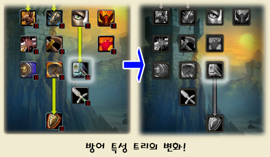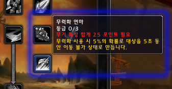 전사 무기 25포인트 이상일 때 올릴 수 있는 무력화 연마 특성이 1.50 버전에서는 무력화의 이동 속도 감소 효과의 증가였다. 하지만 현재 테스트 서버에서 무력화 연마는 그림에서의 설명처럼 무력화 사용 시 일정 확률로 대상을 5초 동안 이동 불가 상태로 만들어 버리게 변경되었다. |