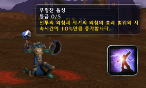 전사 분노 특성에 있는 우렁찬 음성은 기존까지만 해도 전투의 외침과 사기의 외침의 지속 시간만 늘려주는 특성이었다. 하지만 이제는 효과 범위까지 넓혀주어 외침 계열의 효과를 약간 더 부가 시켜주었다. 하지만 이 패치에는 장,단점이 있다. 전투의 외침의 경우 버프류 기술이기 때문에 조금 더 멀리 떨어진 곳에 있는 파티원까지 효과를 얻게 변경 되었다. |