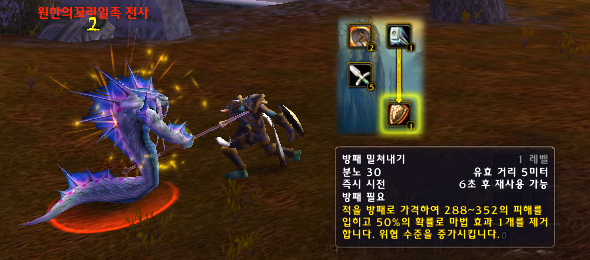 방패 밀쳐내기는 지금까지 있는 전사 기술과는 다르게 방패를 사용해 높은 대미지와 함께 50%라는 높은 확률로 적의 마법 효과 1개를 제거할 수 있고, 위협 수준까지 증가시킬 수 있어 탱커를 목적으로 하는 방어 특성 전사에게는 더 없이 좋은 기술이다. |