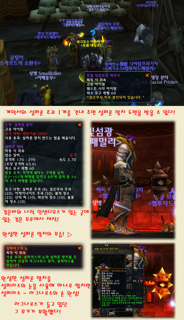 쿠로: 7월 6일 라그나로스를 잡고 설러퍼스 눈이 나왔구요, 전사와 성기사 모두 주사위 1000으로 돌려 975로 눈을 얻게 됐습니다. 어제 저희 공대장이자 메인 탱커인 분타님이 오늘 안에 만들어 보자고 하여 그 동안 화산 심장부를 돌면서 공격대에서 모아둔 정수, 설퍼론 주괴등을 긁어 모아 7월 8일 새벽 1시에 완성! OㅅOv 인센디우스 시체를 밟고 제작했어요. ㅎㅎ