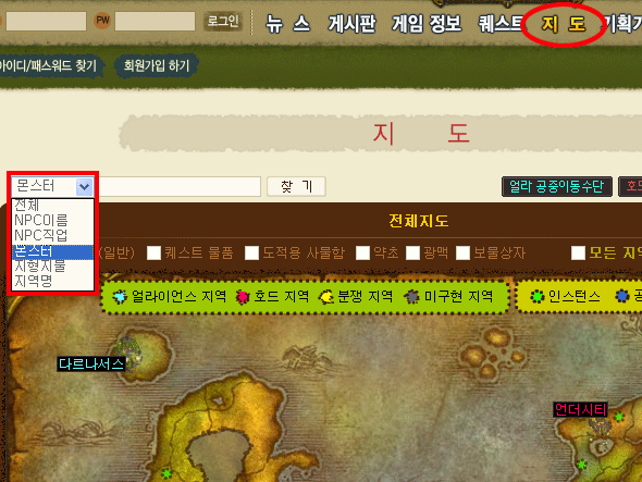 3. 상위메뉴 지도 - 몬스터 검색 이용