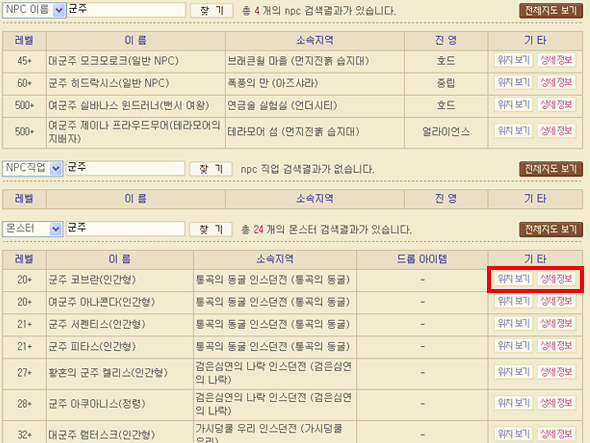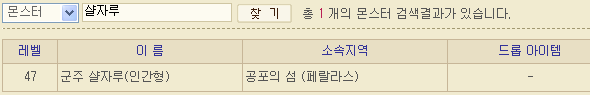 입력한 단어가 포함된 이름의 몬스터들이 검색되며 해당 몬스터의 레벨과 이름, 소속지역, 드롭 아이템, 위치, 상세정보를 찾을 수 있다.