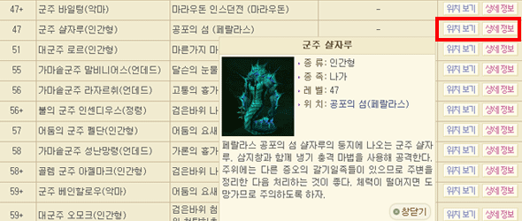 상세정보 클릭시 해당 몬스터의 종류, 종족, 레벨, 위치, 특징등이 소개된다