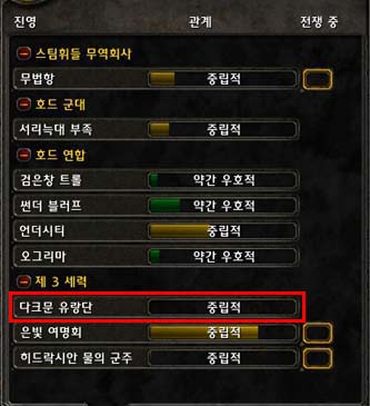 다크문 유랑단은 제3세력으로 구분되어 진영에 추가된다. 제 3세력들인 은빛 여명회나 마른나무가지 펄볼그처럼 평판을 올림으로서 여러가지 아이템을 구매하거나 새로운 퀘스트를 받을 수 있을 것이라 예상된다. 그리고 평판의 상승으로 인한 보상은 기존에 있던 은빛 여명회나 마른나무가지 펄볼그처럼 상당히 유용할 수 있기 때문에 근성을 발휘하여 평판을 올려보자. |