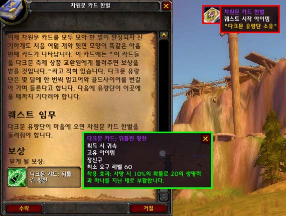 뒤틀린 황천 카드는 차원문 카드를 모아 한벌을 만들면 얻을 수 있는 장신구이다. 착용 효과는 사망 시 10% 확률로 20의 생명력과 마나를 지니고 되살아는 것이다. 흑마법사나 주술사의 윤회보단 성능이 떨어지지만 그에 준하는 능력을 지니고 있다.