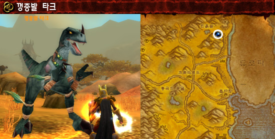 정보: 불모의 땅의 유일하게 검은색을 띄고 있는 랩터인 껑충발 타크는 불모의 땅 북동쪽 최상단에서 나타난다. 사냥꾼이 좋아할만한 이 네임드 몬스터는 발견하기가 매우 어려우며 경쟁자가 치열하여 멸종위치에 처하기도 한다. 주로 잡아서 아이템을 얻는 것보단 사냥꾼의 펫으로 인기가 많다.