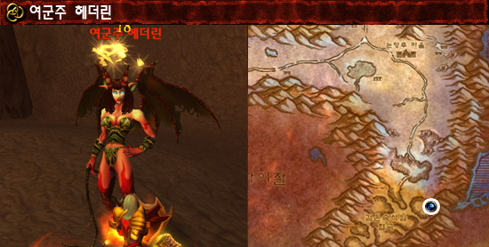 정보: 검은속삭임 협곡에 분포되어 있는 몬스터 이름의 대부분은 헤더린의 신도, 척살자, 마나사냥개등이 주를 이룬다. 이들을 이끄는 것이 바로 이 여군주 헤더린인 것이다. 서큐버스와 생김새도 똑같지만 흑마법사가 사용하는 서큐버스와는 차원이 다르다. 주 공격은 채찍으로 공격하지만 간혹 사용하는 정신지배와 암흑의 화살은 상당히 치명적이다. 혼자서는 절대 처치 불가능이며 최소 3명은 되야 잡을 수 있다.