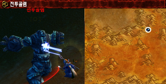 정보: 고통의 요새에서 나타나는 전투골렘은 아마 검은무쇠단 드워프들이 자신들을 위하여 제작한 골렘으로 보인다. 전투를 위한 골렘이지만 아무래도 실패작이 아닌가 싶다. 강력한 기술도 없고 맷집도 그냥 그런 평범한 네임드 몬스터이다.