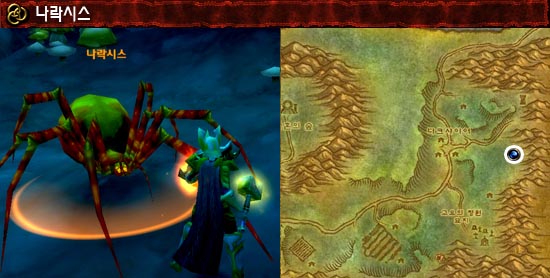 정보: 다크샤이어 마을에서 동쪽으로 가다보면 작은 동굴이 하나 있다. 이곳의 주변에는 작은 거미들이 살고 있으며 그 동굴속에는 일반 거미보다 크기가 좀더 크고 색깔이 붉은 색을 띤 거미가 하나 나타난다. 거미의 습성대로 먹이를 향해 거미줄을 뱉어 움직이지 못하게 만들고 공격한다. 이 끈끈한 거미줄은 마법 해제 같은 것으로는 절대! 안 풀리니 마나를 아끼도록 하자. 한 가지 추천으로는 나락시스가 주는 흉갑은 입으면 정말 멋지다.