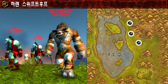 정보: 이 녀석들은 정말 발견하기 힘들었다. 주기적으로 뜨는 것도 아니고 정말 어쩌다가 나타나기 때문이다. 또한 몬스터 외형이 워낙 눈에 띄기 때문에 호기심 많은 인간들에 의해 많은 죽임을 당한다. 그렇기 때문에 먼저 발견하지 않는 이상 이들을 만나기가 지휘의 문장에 크리티컬이 뜨는 수준이다. 또한 호드 길잡이라고 하는 이들은 타우렌 하렌 스위프트후프와 오크 타라곰, 그라독과 항상 같이 다닌다.