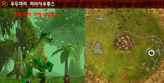 정보: 운고르 분화구는 옛날 운석이 떨어져 만들어 진 곳 이라고 들은 적이 있다. 분화구 남동쪽에 있는 늪지대에는 라바사우루스 무리들이 서식하고 있으며 이곳에서 알을 낳고 번식을 하고 있었다. 이 라바사우르스들은 동족에 대한 의식이 강하여 자신이 위험할 정도가 되면 도움을 요청한다. 그리고 커다란 발톱으로 적을 공격하여 분쇄라는 기술을 사용한다.
