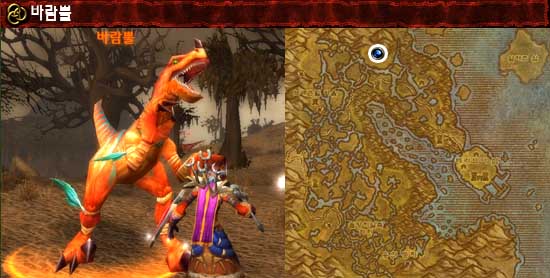 정보: 먼지진흙 습지대 북서쪽에는 많은 붉은 렙터 공룡들이 살고 있다. 이 녀석들은 트롤들이 탈 것으로 많이 이용하기도 한다고 한다. 혹시 이 바람뿔이라는 녀석은 아마 천골드에 팔린다는 그 녀석이 아닐까? 바람뿔이라는 이름대로 매우 빠른 이동 속도를 가지고 있었고 붉은 렙터 무리 주변을 쉬지 않고 달리고 있었다.