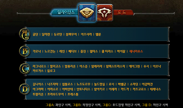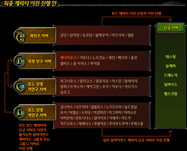 그룹 D: 저인구 서버의 얼라이언스 중 신규 서버로 이전이 불가능하게 된 인원과 모든 호드 인원은 그룹 B: 적정인구 서버와 그룹 C: 호드 진영 저인구 서버로 이전되게 됩니다. 최종 캐릭터 이전 진행 안에 따라 기존 7개의 신규 서버를 생성할 계획에서 5개로 신규 서버의 숫자가 감소하게 되었습니다. 따라서 그룹 D: 저인구 서버의 얼라이언스 중 일부는 신규 이전이 불가능하게 되었으며, 이에 따라 그룹 D: 저인구 서버의 호드 인원과 함께 그룹 B: 적정인구 서버와 그룹 C: 호드 진영 저인구 서버로 이전이 진행됩니다.