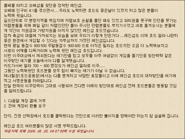 레인서버 유저의 시위글 (출처: 블리자드 공식 토론 게시판)