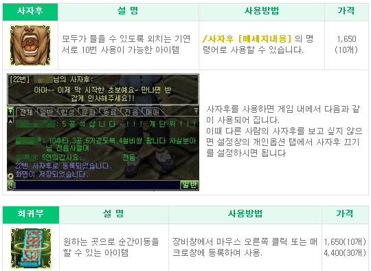빠른 이동에 필요한 무영풍과 한 번에 많은 짐을 들 수 있는 당나귀 등을 사는데 B군이 사용한 돈은 총 223,600원이다. 단순한 장사만을 위해서라면 무영풍과 당나귀세트만 구입하면 되지만 천하제일상이 되려면 아무래도 전투를 할 수 밖에 없기 때문에 주저 없이 나머지 아이템도 구입해 두었다. 그나마 다행스러운 점은 무영풍을 제외한 아이템에는 시간제한이 없기 때문에 이후에는 매달 무영풍 값만 지불하면 된다는 것이다.