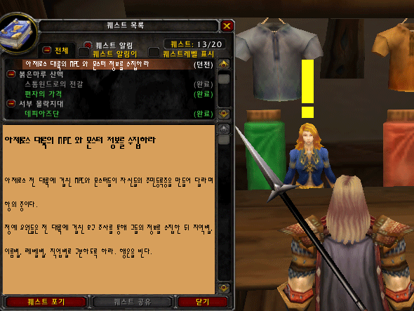 [ ! ] 아제로스 전 대륙에 걸친 NPC와 몬스터들이 자신들의 주민등록증을 만들어 달라며 항의 중이다. 정예 요원들은 전 대륙에 걸친 호구 조사를 통해 그들의 정보를 수집한 뒤 지역별, 이름별, 레벨별, 직업별로 구분하도록 하라. 행운을 빈다.