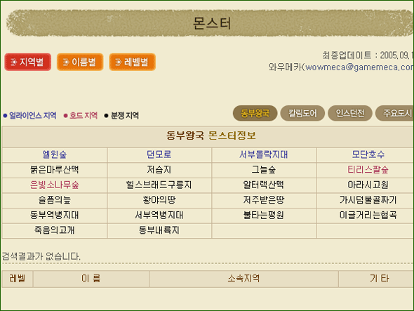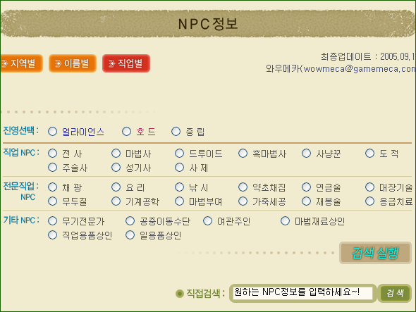 [ ? ] 상위메뉴 NPC정보를 클릭하면 지역별, 이름별, 직업별로 원하는 정보를 찾을 수 있으며 몬스터의 경우 지역별, 이름별, 레벨별로 해당 정보를 찾으실 수 있습니다.