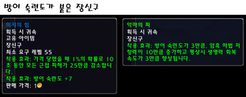 이 기사는 방어 숙련도에 관련된 아이템 소개 및 방어 숙련도의 하향으로 인해 새롭게 부각된 회피 아이템을 중점적으로 소개하고 있다. 여러 종류의 아이템이 있으니 자신에게 가장 이상적인 세팅을 하여 하향된 방어 숙련도를 보충하고 좀 더 든든한 전사가 되어보자.