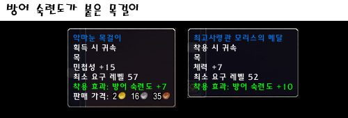 민첩과 방어 숙련도로 인해 전사 외에도 사냥꾼, 도적들이 애용하는 목걸이이다.