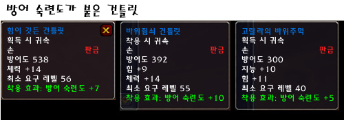 방어도와 체력 거기다 덤으로 방어 숙련도가 붙었다. 바위죔쇠 건틀릿이 없다면 강추 아이템이다.
