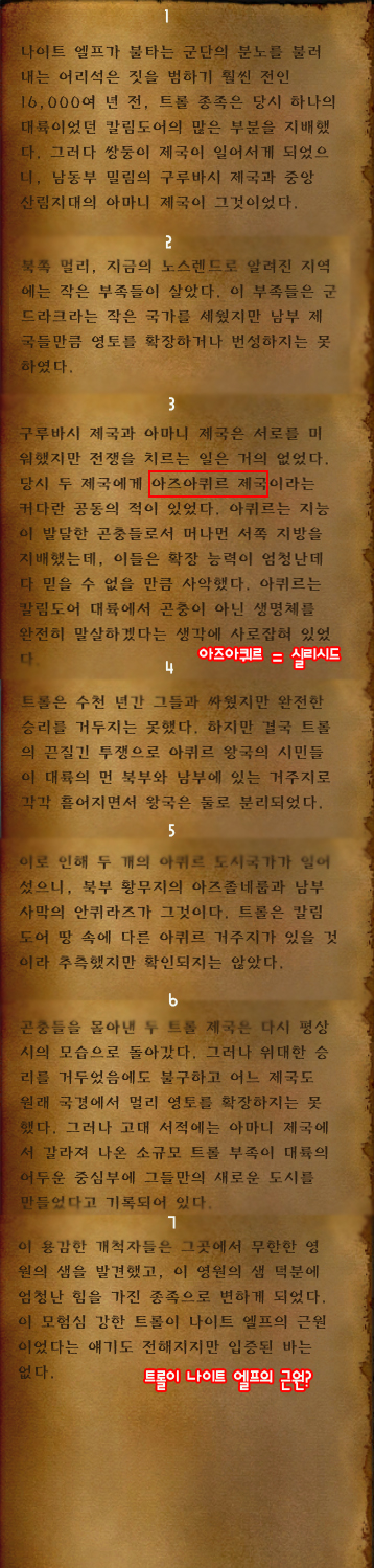 고대시대에 칼림도어는 트롤의 땅 이였고 나이트엘프의 근원을 엿볼