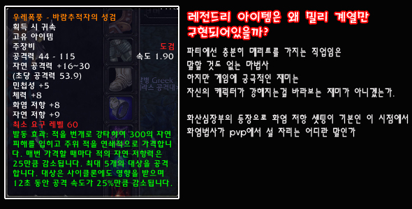 필자의 짧은 소견으론... 레전드리급이면 솔직히 저 정도 옵션은 줘도 괜찮은 것은 아닐까? 썬더퓨리의 사기적인 발동효과를 눈앞에서 목격한 한 유저로써 마나 흡수 옵션이 사기라고 생각되진 않는다. 다만, 언제나 그렇듯 적절한~ 적절한 선이 필요하다.