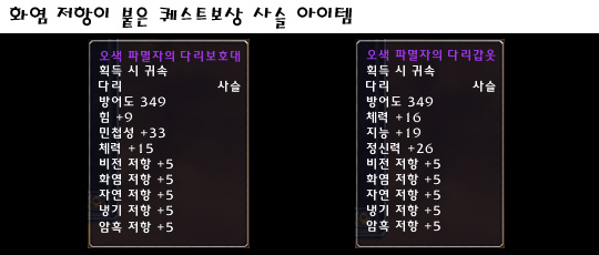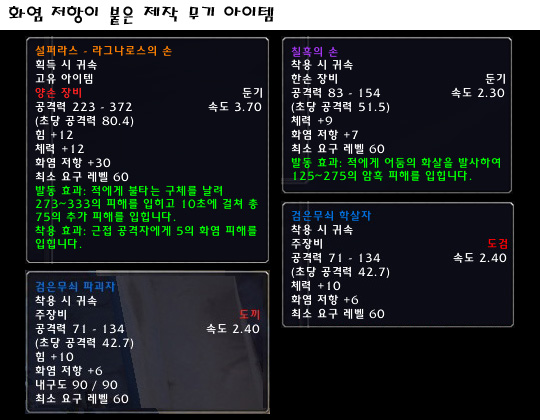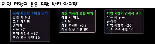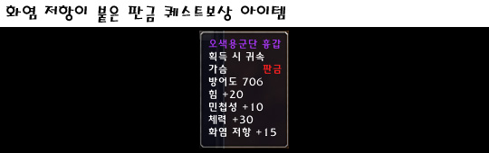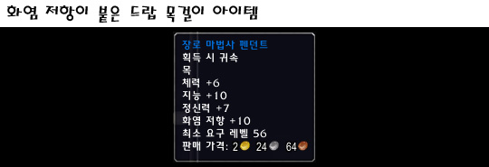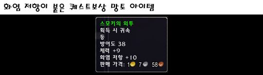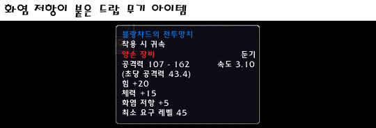 저항 자체는 높은 편이 아니지만, 그 외에 옵션이 워낙 좋아서 낮은 화염 저항을 커버해준다.