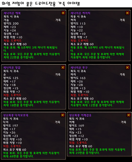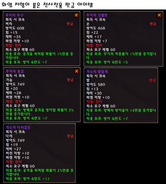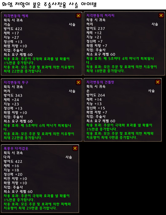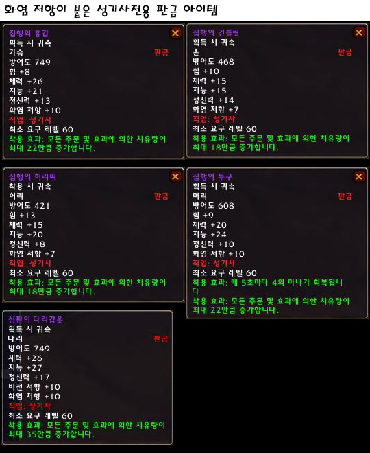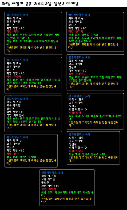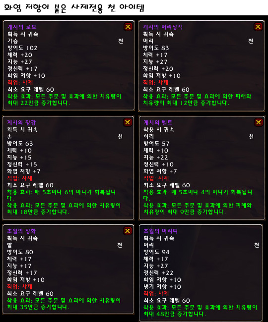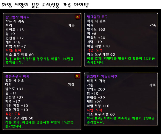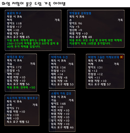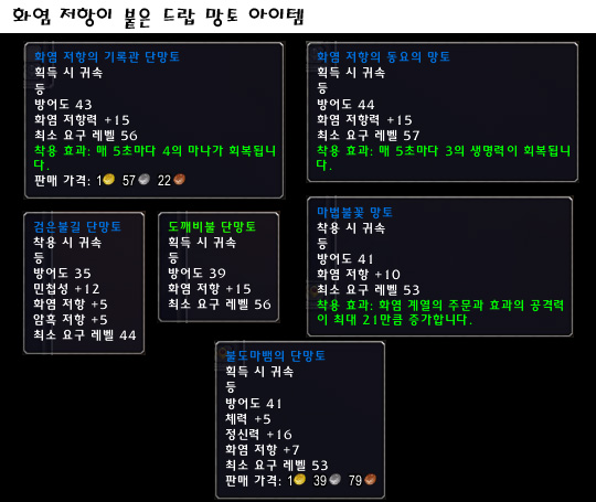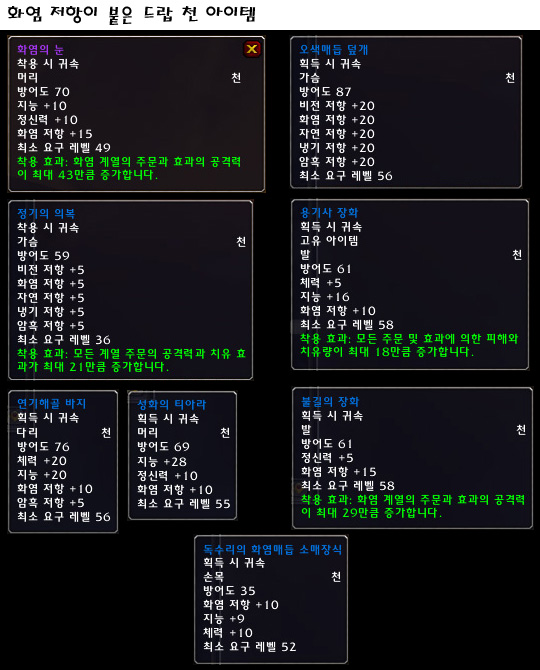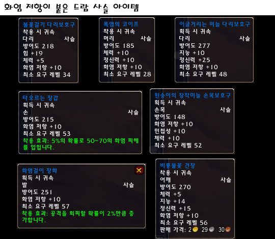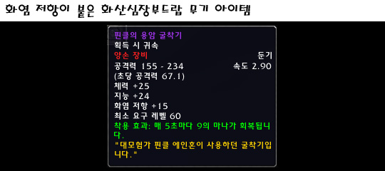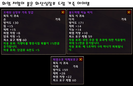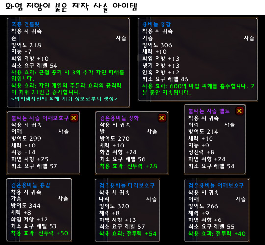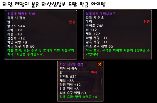 화산심장부가 먼 동네 얘기로 들리던 시절에는 이 아이템이 과연 필요한 것인가? 라는 생각과 함께 상점으로 또는 마법부여 재료로 변한 아이템들이 많이 있을 것이다. 하지만 많은 유저들이 레이드를 다니면서 이런 행동에 뼈저린 후회를 하였다. 물론 이런 유저 사이에 필자도 끼어 있다 -.-;;