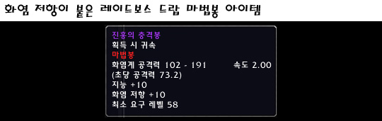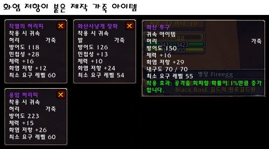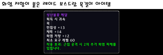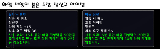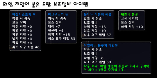 화산심장부, 검은날개 둥지 같은 레이드 던전을 다니면서 많은 유저들이 공통적으로 느끼는 부분은 무엇일까? 바로 화염 저항이다. 웬만한 화염 저항으로는 화염 공격을 주로 하는 화산심장부나 검은날개 둥지에서 버텨낼 재간이 없다. 많은 공대들이 이러한 상황을 극복하기 위해 화염 저항 아이템을 찾거나 제작을 하고 있다.