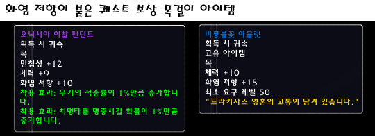 화산심장부의 라그나로스, 오닉시아, 검은날개 둥지의 몬스터들 이런 몬스터의 화염 공격을 제대로 못 견디고 쓰러진다면 공대원들에게 미안해지는 것은 물론 사기 저하까지 불러일으킨다. 이런 상황을 벗어나기 위해 자신에게 어울리는 화염 저항 아이템을 얻어 오닉시아의 브레스, 라그나로스의 불의 세례 등이 간지러워지는 그날까지~~ 화염 저항을 맞추어 보자!