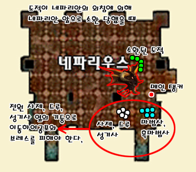 이렇게 두 입구에서 용기병들을 처리를 하다보면 네파리안이 적들의 사기가 떨어지고 있다.. ~~~ 하는 외침을 한후 드레곤폼으로 변신을 하게됩니다. 이 네파가 착지하는데에는 대략 20초정도 걸리는듯 하니 그 시간동안 최대한 남은 용기병들을 처리하시고 메인탱커를 제외한 모든 공대원들은 왼쪽 입구로 모여야 합니다.