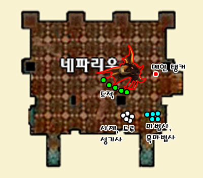 ◈점사(오른쪽)파티엔 냥꾼 도적 무분전사와 방태전사3~4명을 배치 절대로 몹이 왼쪽으로 빠져나가지 않게 전사 사냥꾼 도적분들의 집중이 필요합니다.