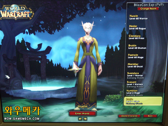 미리 만들어져 있는 캐릭터는 기존 종족의 직업별 캐릭터의 60레벨 캐릭터 견본과, 여기에 추가적으로 새로 추가된 종족인 블러드엘프 전사, 마법사, 흑마법사, 사제 등의 1레벨 캐릭터들을 선택할 수 있다.