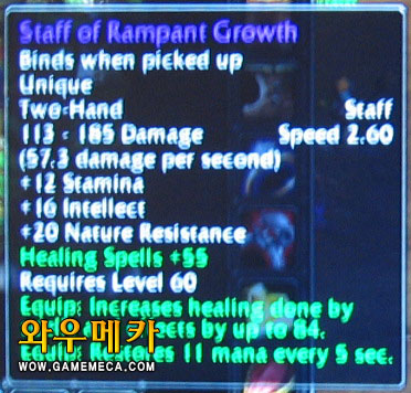 지팡이/치유량 증가 84/매 5초마다 마나 11 회복/체력+12/지능+16/자연저항+20