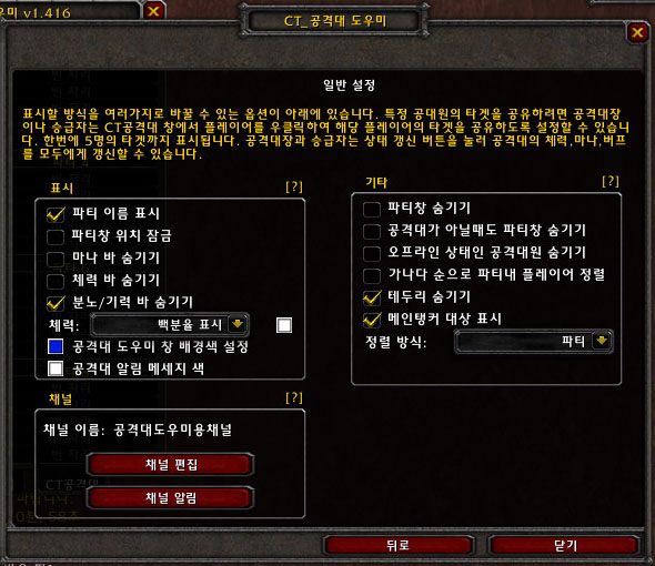 우선 공격대 도우미는 1.4 버전 이전까지만 해도 ‘반드시’ 공격대 도우미용 공개채널을 설정해야만 정상적으로 작동하였습니다. 1.4 버전부터는 공개채널을 설정하지 않더라도 공격대원의 체력 및 버프, 디버프 표시등의 최소한의 기본적인 기능은 작동하기 때문에 필수적인 사항은 아니게 되었지만 그래도 공격대 도우미의 모든 기능을 활용하려 한다면 채널을 설정해 주는 것이 원칙입니다.