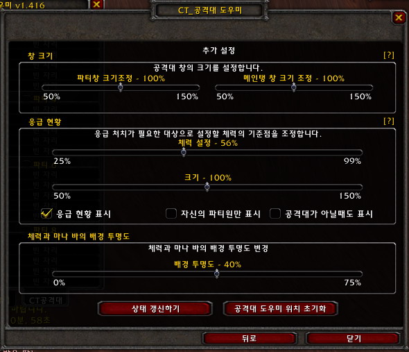 응급 현황 기능은 일정 수치 이하의 생명력을 가진 공대원 5명을 화면에 표시하여 손쉽게 빈사 상태의 공대원을 치유할 수 있도록 도와줍니다. 이 기능을 사용하기 위해선 설정 메뉴 중 ‘추가 설정’ 메뉴에서 응급 현황 표시 옵션에 체크하고 생명력 수치를 설정해주면 됩니다.