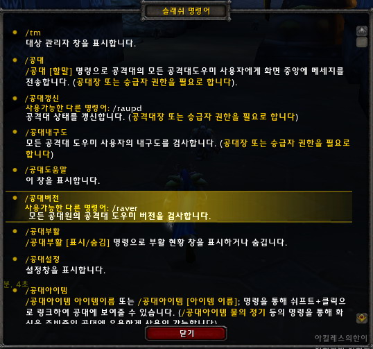 공격대 도우미엔 수많은 종류의 기능들이 있지만 이를 다 소개하기엔 지면상 어려울 것 같습니다. /공대도움말 명령어를 사용하면 공격대 도우미 명령어들이 나열된 창이 표시됩니다.