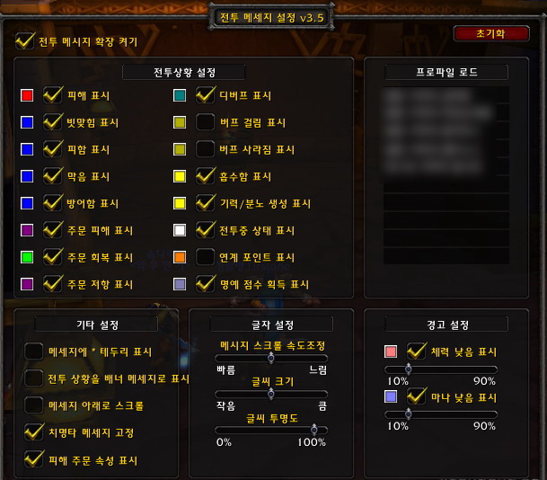 설정창을 보면 각종 전투 상황에 대한 옵션이 있는데, 자신이 원하는 정보만 표시하도록 체크하는 것으로 설정은 끝입니다. 공격대에서 특히 유용한 것으로는 디버프 이름을 표시해주는 것과 공격받을 시 속성을 표시해주는 기능으로, 몹의 공격 속성 파악이 공략의 기본임을 생각해 볼 때 대단히 유용한 기능이라고 생각합니다. 전투 메시지 확장기능을 켜면 다음과 같은 화면을 볼 수 있게 됩니다. 다소 화면이 지저분해 보일수도 있으므로 깔끔한 화면을 선호하는 사용자에겐 맞지 않을 수도 있습니다. |