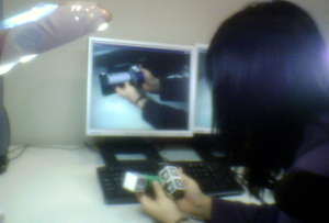 그냥 눈으로 보기엔 평범한 나무토막이 특수안경을 쓰고보면 화려한 MP3플레이어로 변한다.  실제로는 나무토막을 펜으로 찌르지만 안경속 화면은 전자펜으로 MP3P의 버튼을 누르는 것이다.