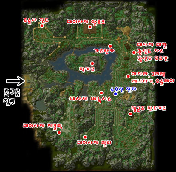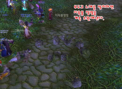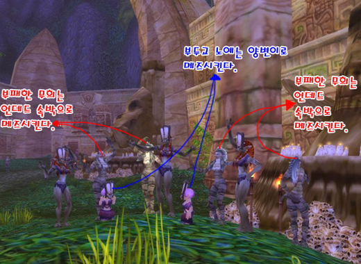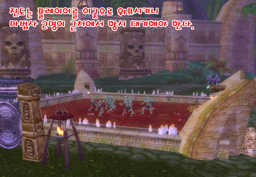 4. 진도는 랜덤하게 플레이어를 해골이 몰려있는 제단으로 워프시킨다. 제단의 해골들은 일반 몬스터로 상당히 약하지만 숫자가 꽤 많으며 지속적으로 리젠되니 그 주변에 마법사 두명을 상주시켜 워프되는 플레이어가 있으면 광역 마법으로 빠르게 해골들을 처리하고 워프된 플레이어를 살리도록 하자.