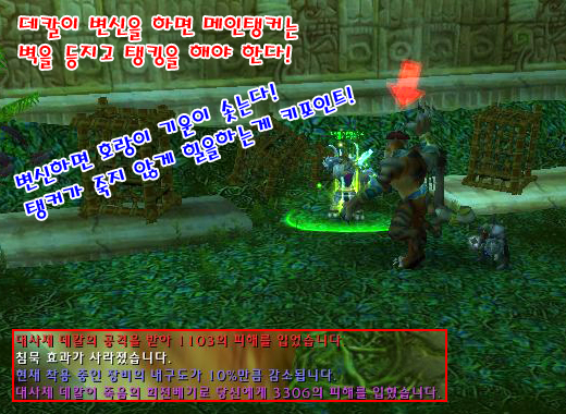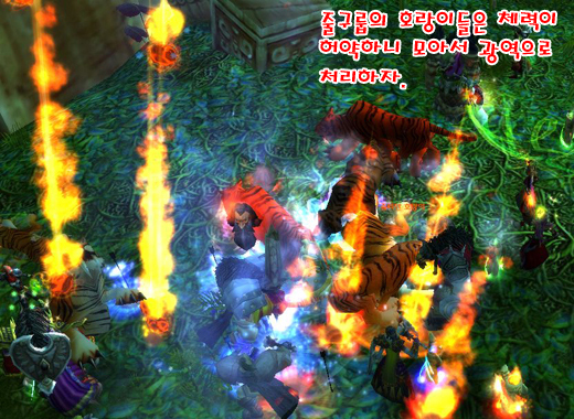 2. 우선 3명의 전사가 데칼, 로르칸, 자스를 동시에 풀링하여 시작을 하자. 그 외 2마리의 호랑이가 함께 덤벼오는데 변이와 일점사로 간단히 처리할 수 있다. 여기서 가장 유의할 점은 로르칸이 주술사란 점이다. 한마디로 힐을 사용하니 당연히 로르칸은 데칼과 자스와 거리가 멀리 떨어져 있어야 한다. 만약 붙어 있으면 지속적인 힐로 인해 공략은 실패한 거나 다름 없다.