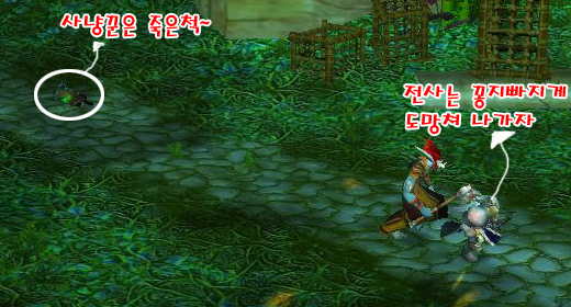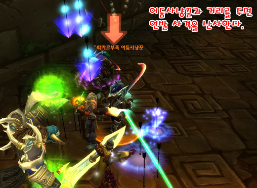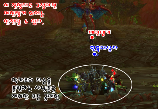 3. 우선 사냥꾼 2명이 필수이다. 그리고 진영은 위에 소개한 그림처럼 구성하고 양쪽에 지속적으로 리젠되는 학카르의 자손을 사냥꾼들이 계속 끌어와야 한다.