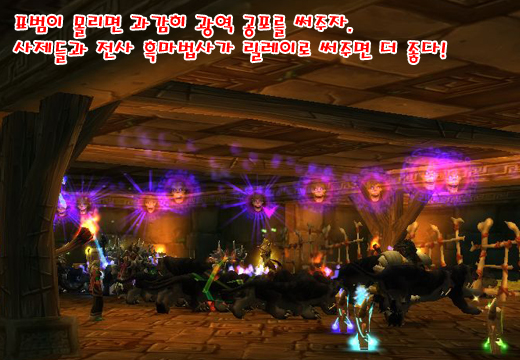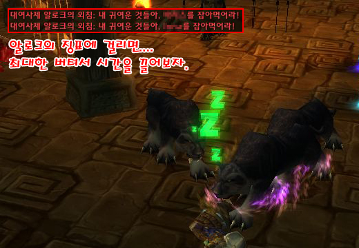 4. 표범 우리에 있는 플레이어를 제외한 나머지는 알로크를 일점사 하도록 하자. 표범 우리에 저렇게 있어도 약간씩 표범이 빠져나오니 숫자가 약간 늘어난다 싶으면 광역 공격으로 녹여버리고 알로크를 공격하자. 사제나 드루이드들은 표범 우리에 있는 플레이어에게 간간히 도트힐을 넣어주면 좋다. 그 외 흑마법사는 생명석을 언제나 구비했다가 표범우리에 있는 플레이어에게 배달을 하자. 알로크의 은신이 3~4회 지속되는 동안 표범 우리의 플레이어가 생존한다면 알로크는 이미 쓰러져 있을 것이다.