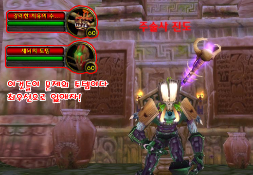 2. 메인 탱커가 진도를 풀링하여 약간의 어그로 시간을 가지자. 진도는 도발 면역이다. 진도는 2종류의 토템을 사용하는데 이 토템들의 위력이 대단하다. 세뇌의 토템은 생성되는 즉시 아무나 세뇌시켜 버린다. 그리고 강력한 치유의 토템을 사용하는데 이것은 진도의 체력을 회복시킨다. 주술사의 치유의 토템과는 비교도 안될 정도로 성능이 강력하며 토템 자체체력도 높다. 이 토템들은 생성되는 즉시 일점사로 빠르게 없애야 한다.